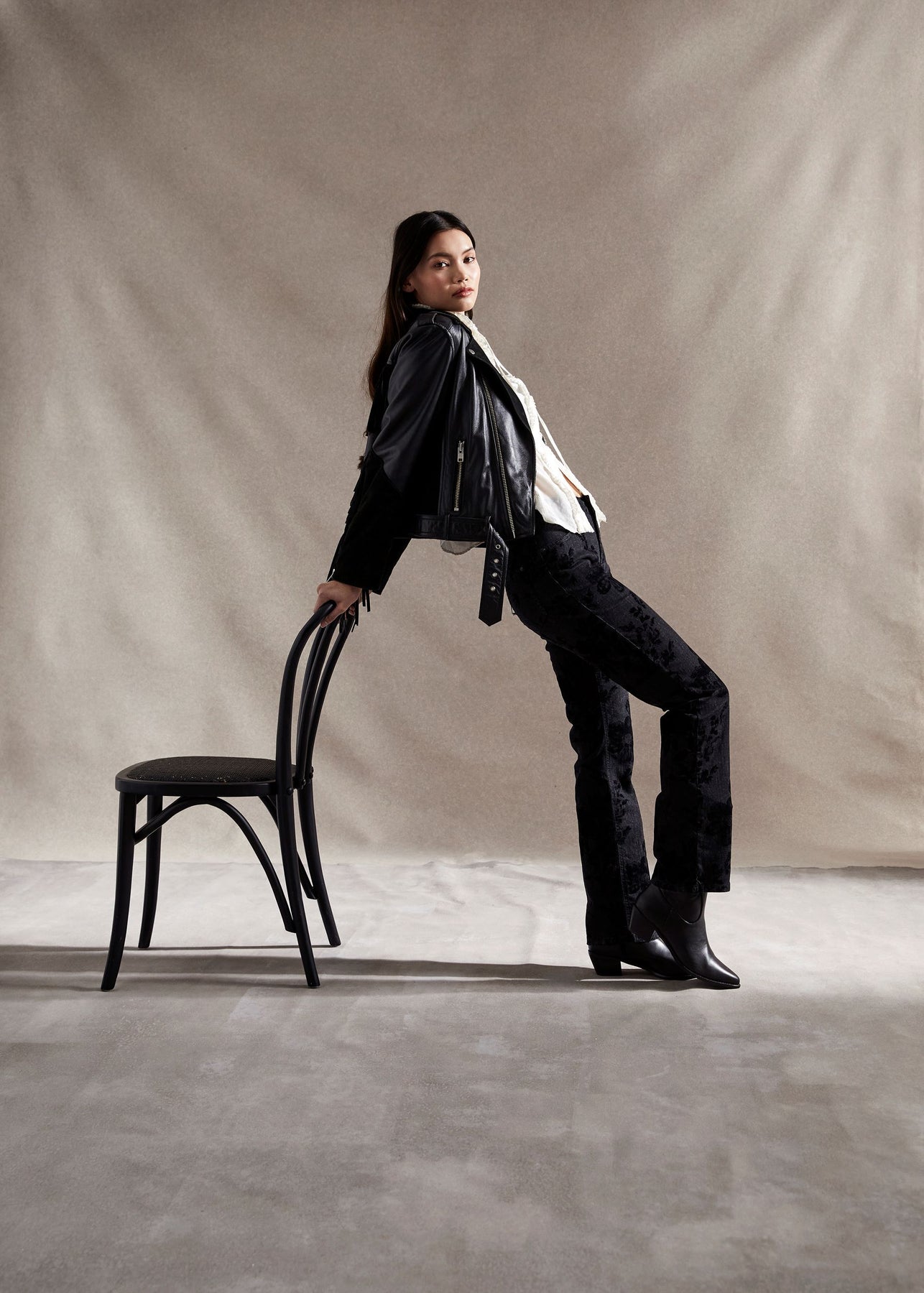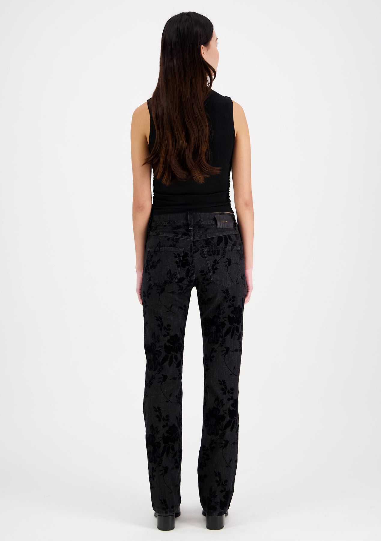 Ajankohtainen kukkakuosi on toteutettu joustavaan denim-kankaaseen samettipainatuksena – näyttävä mutta ajaton yksityiskohta.