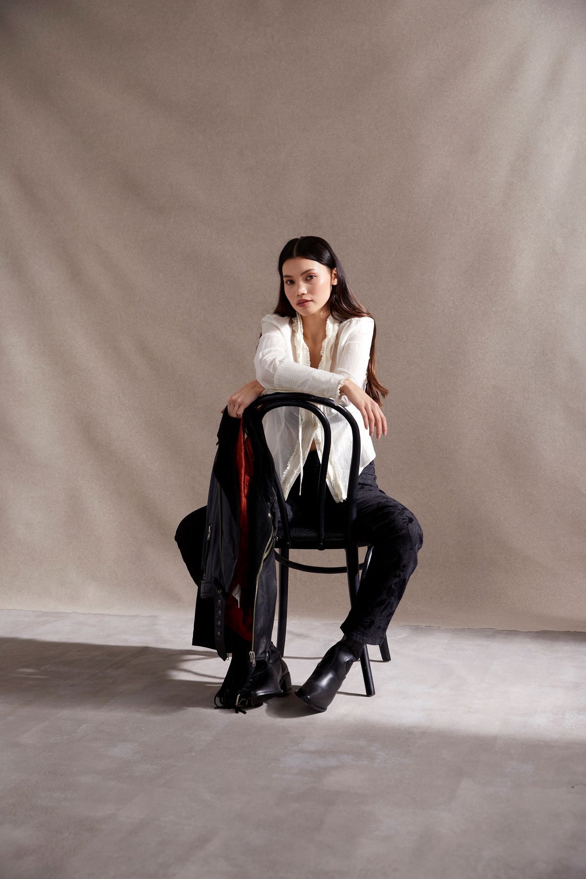 Korkea vyötärö imartelee vartaloa ja tuo ryhtiä, kun taas suorat lahkeet luovat klassisen, aina toimivan siluetin.