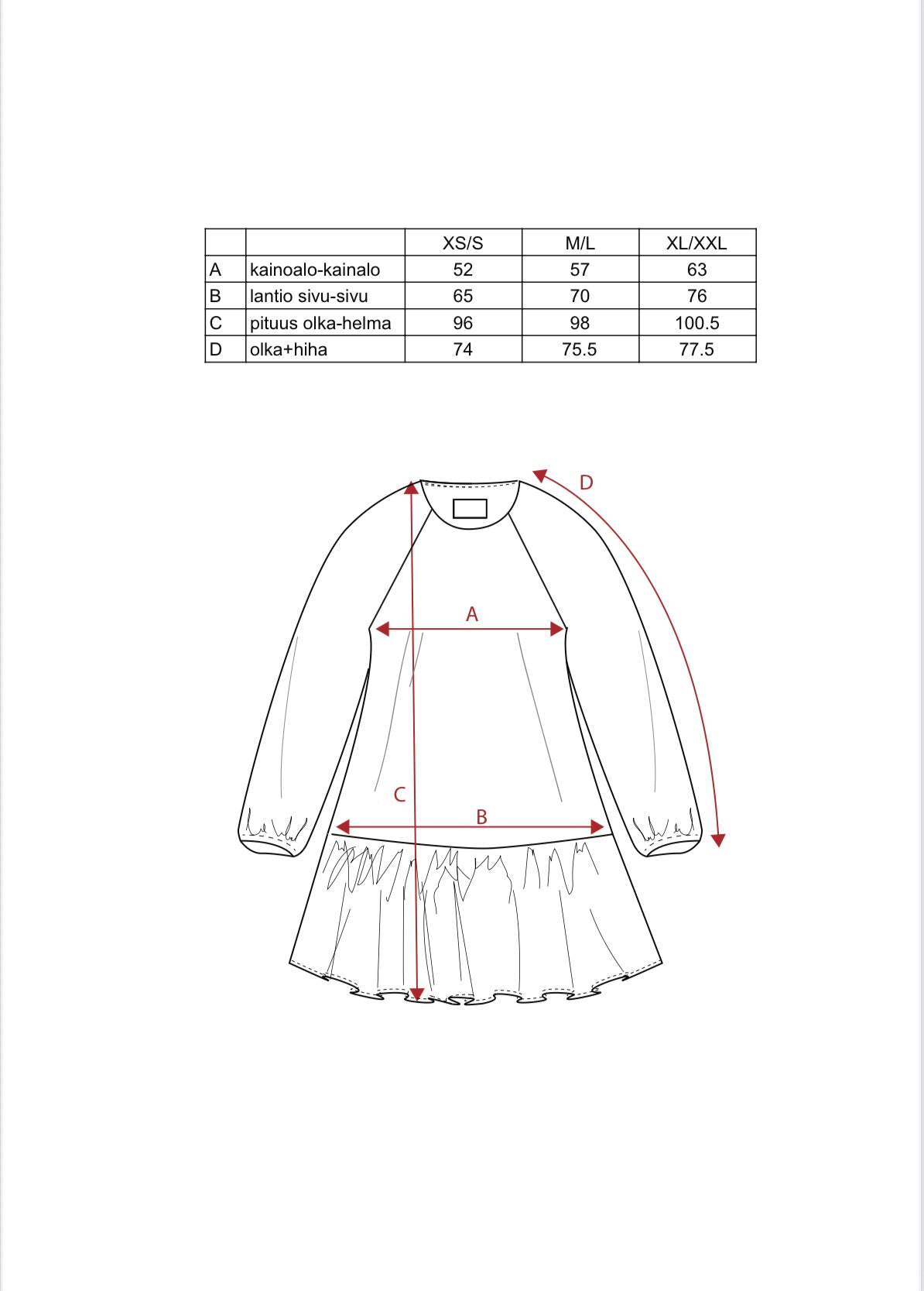Kokopituus: XS/S (98cm) M/L (100cm) XL/XXL (102cm)