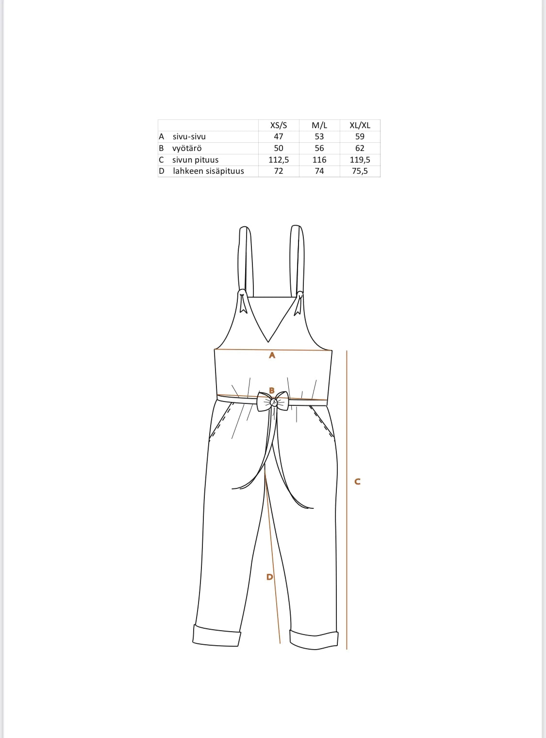 Haalarin lahkeet on suunniteltu niin että suorana ne menevät myös pidemmille sekä lyhyemmille taas lahkeet käärimällä. Mukaan kuuluu vyötärönauha. Haalarissa on sivutaskut. Katso uusi mitoitus mittataulukosta.