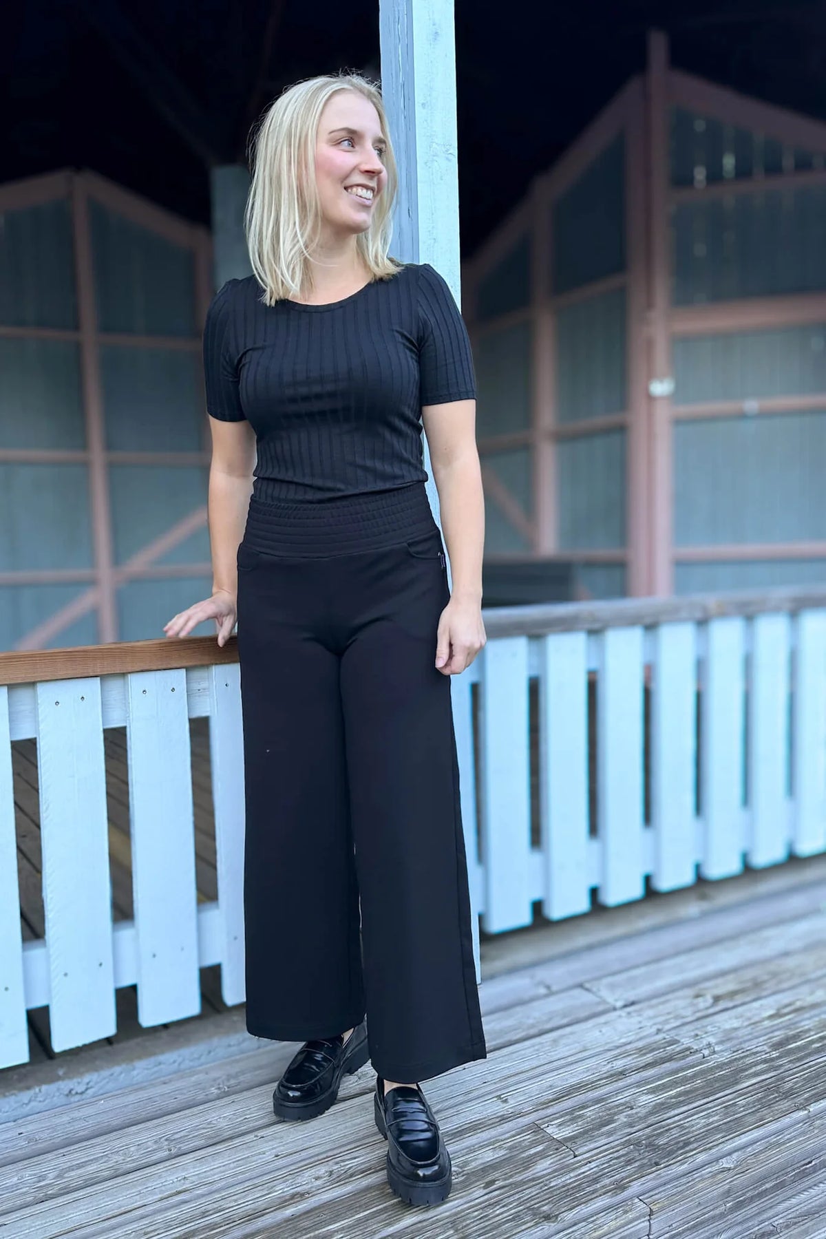 Klassisen mustat kotimaisen Hujaus-brändin leveälahkeiset Aava-housut ovat tyylikäs ja mukava valinta jokapäiväiseen käyttöön!