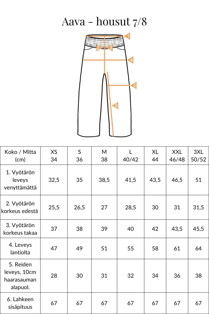 Aava-housut ovat erittäin mukavat päällä ja sopivat monenlaiseen käyttöön. Aava-housuissa on leveä rypytetty kuminauhavyötärö ja edessä taskut. Pystymallinen tasku sopii hyvin myös lanteikkaalle eikä aukea käytössä. Vyötärö on korkeahko ja leveä rypytetty kuminauhavyötärö on mukava ja ryhdikäs. Lahkeenmitta on pituudeltaan 7/8 eli nilkkapituinen ja lahkeen malli leveä. Materiaalina viskoosipohjainen joustava neulos.