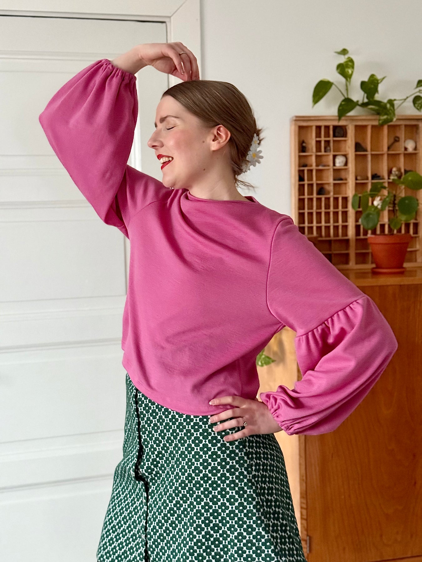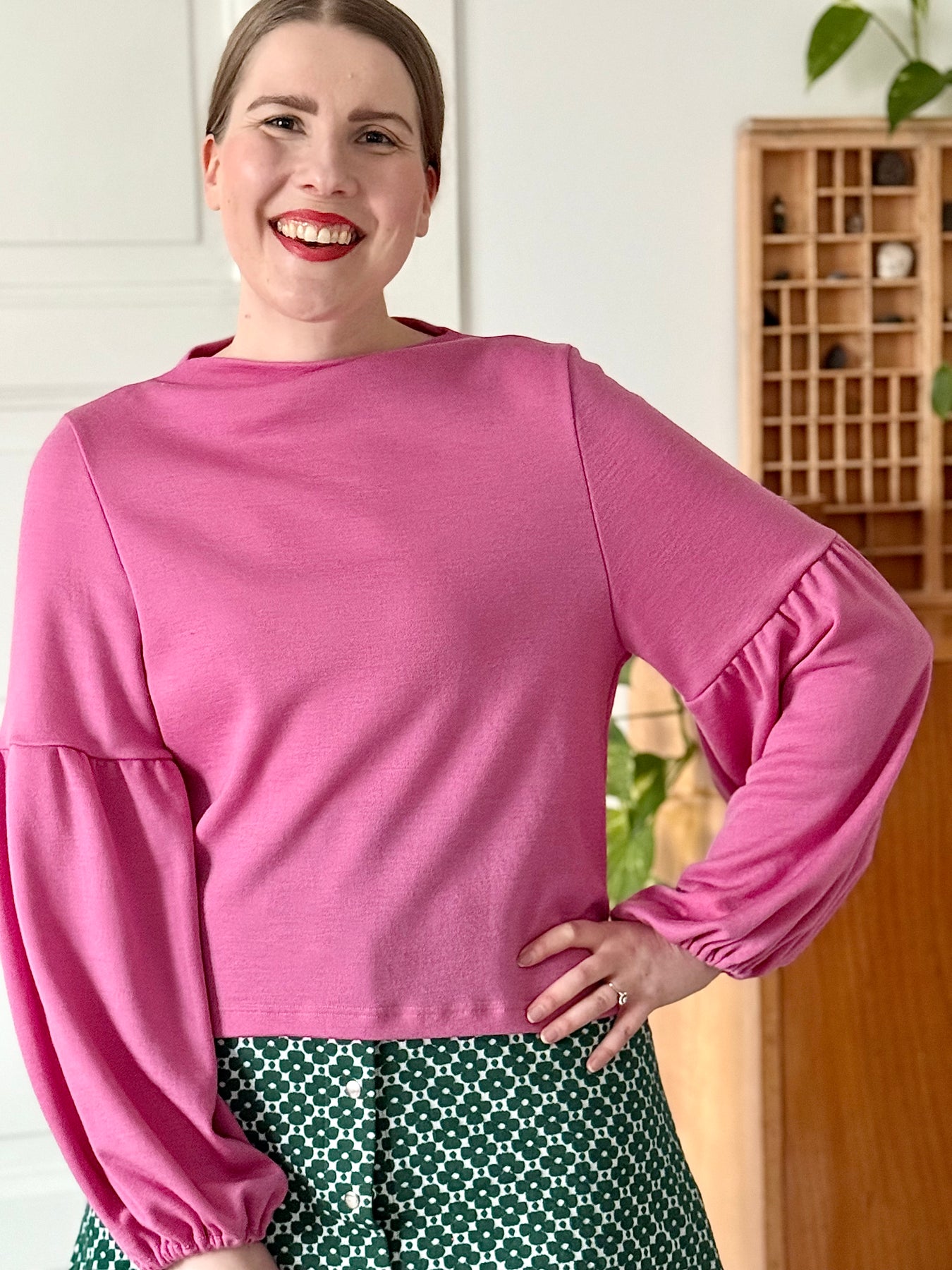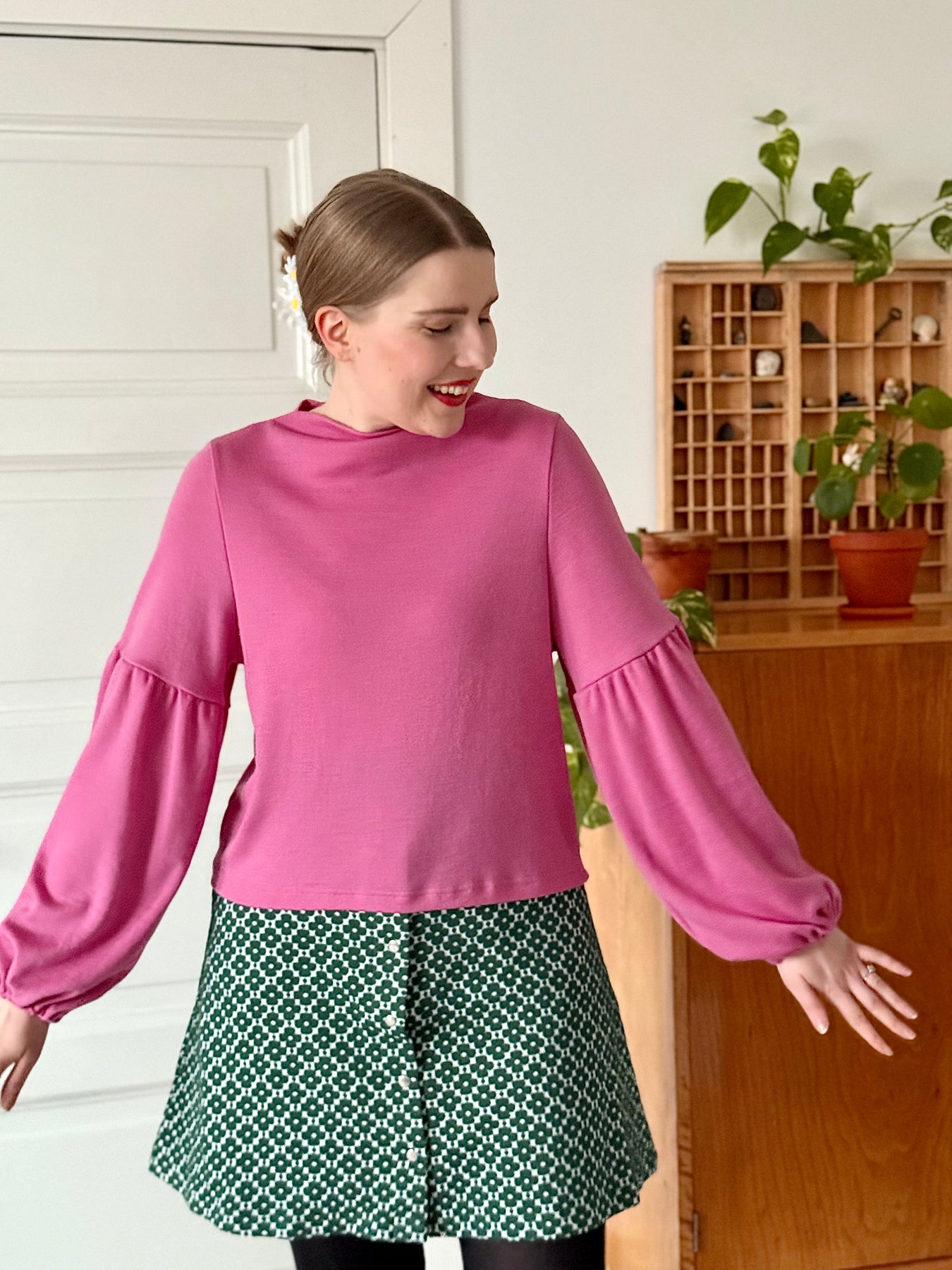 Suora ja lyhyt malli, joka korostaa upeita pussihihoja. Savupiippukaulus, hihansuissa kuminauhat. Toimii parhaiten hieman korkeavyötäröisempien alaosien kanssa.
